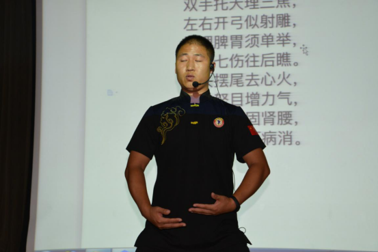 经过了短暂的休息后,学员们迎来了今天的第二堂课。这是一堂别开生面的讲课。本次培训的实训课教练,嵩山少林寺武术馆武术学院武训部副主任,全国武术冠军,优秀运动员,日本少林武术学校名誉教练,武术馆武术学院驻京教学部主任王光辉为大家带来了一堂少林八段锦的授课。